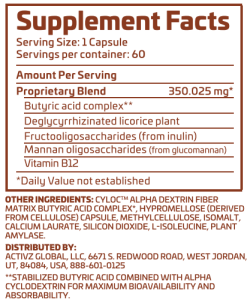 CyLoc ™ matriz de fibra de alfa dextrina Complejo de ácido butírico 300 mg. *, Cápsula de hipromelosa (derivada de la celulosa), metilcelulosa, isomalto-oligosacáridos, laurato de calcio, l-isoleucina, amilasa vegetal.** Ácido butírico estabilizado como soluble , ácido graso libre individual puro en una trampa molecular de matriz de hexadextrina combinada con el agente de liberación DexKey ™ (patente pendiente, Al Czap, Czap R&D, con licencia de Tesseract Medical Research, LLC) CyLoc ™ y DexKey ™ son marcas comerciales de Tesseract Medical Research, LLC .